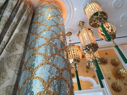 of the property's lake and fountain show. Conceived as a palatial court, space is layered with rich finishes and materials to appeal to the Chinese taste for grandeur.